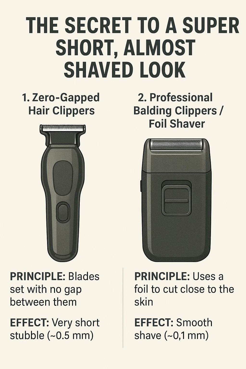 Чтобы добиться чрезвычайно короткой длины, которую вы описываете, от 0,1 до 0,5 мм, обычные бытовые машинки для стрижки волос и их защитные расчески (направляющие расчески) не подойдут. Ключевым моментом здесь является отсутствие защиты расчески: необходимо снять все направляющие насадки, чтобы лезвия машинки для стрижки могли напрямую контактировать с кожей.